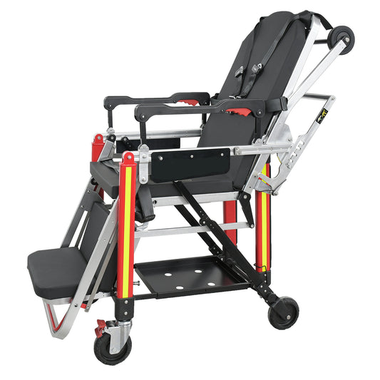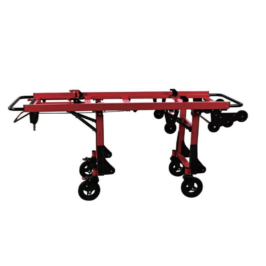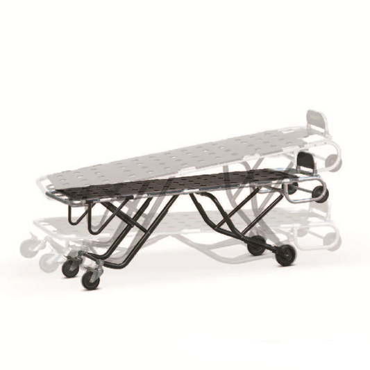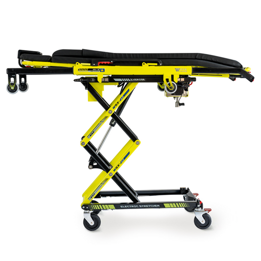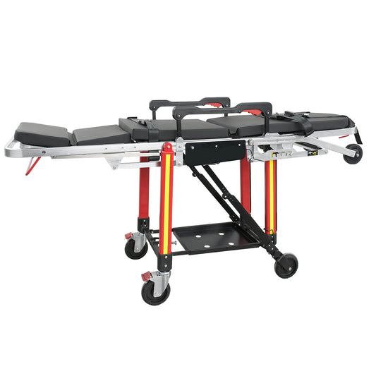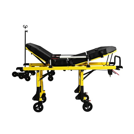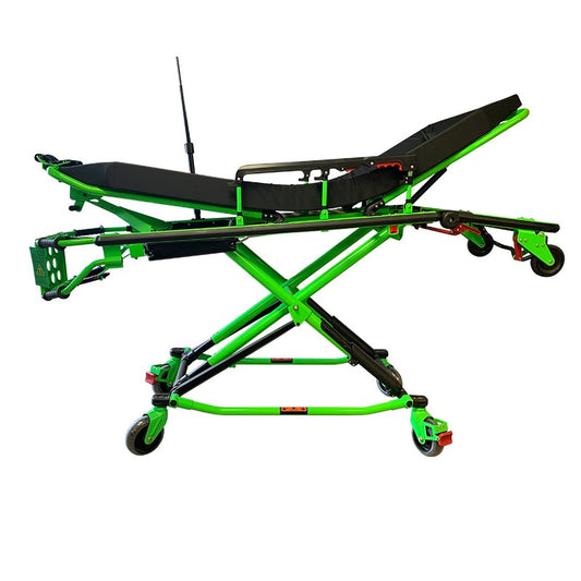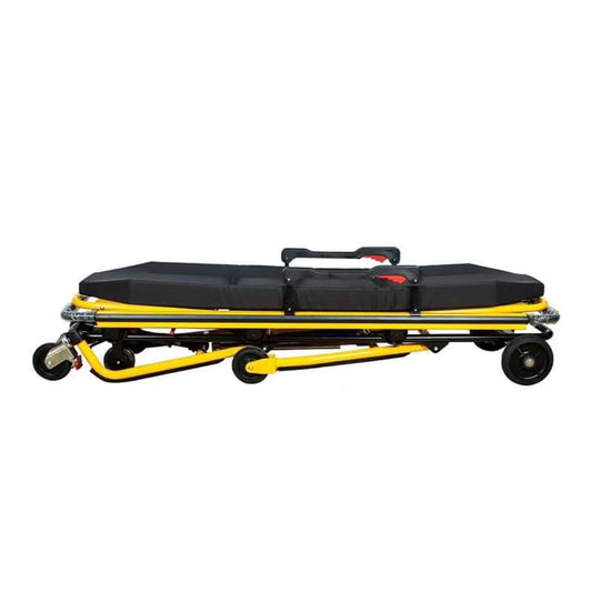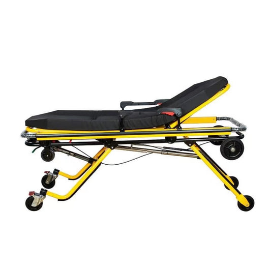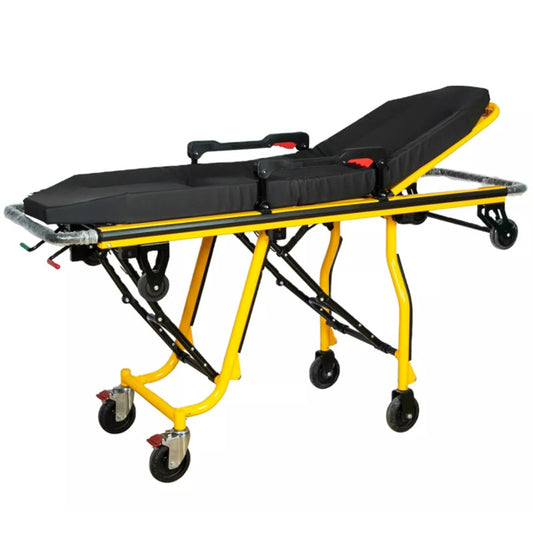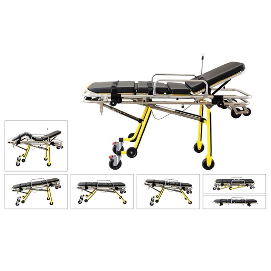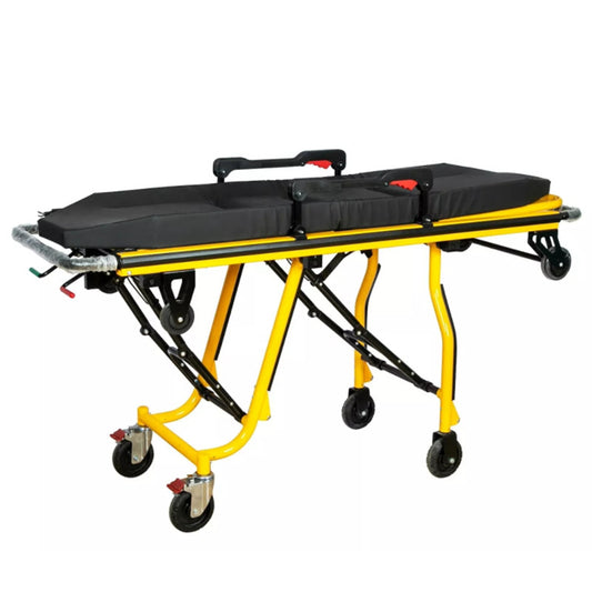 Hydraulic emergency bed foldable stretcher trolley used in hospital to transport sick and wounded person.